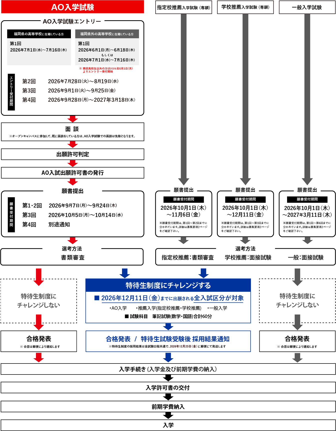 - AO入学試験のエントリーは、福岡県の高校に在籍している方:2026年7月1日(水)~ / 福岡県外の高校に在籍している方および現役高校生以外の方 2026年6月1日(月)~ もしくは7月1日(水)~受付を開始します。